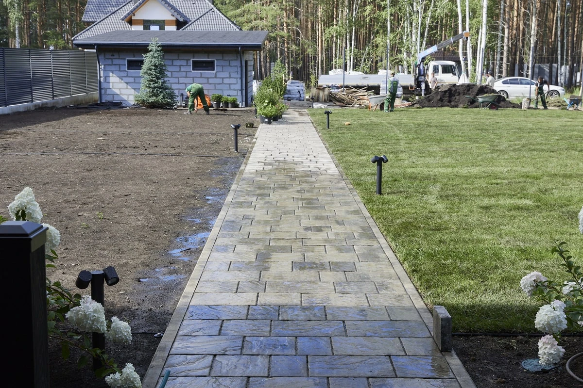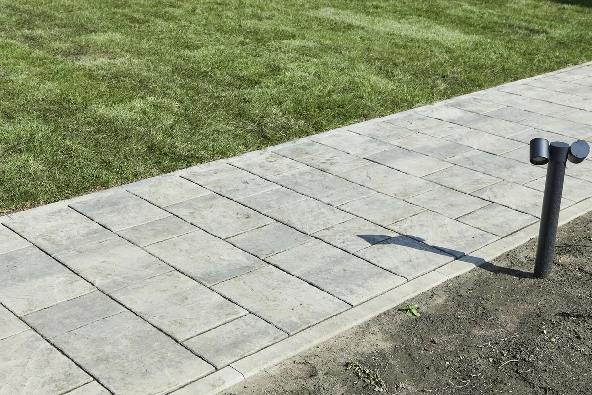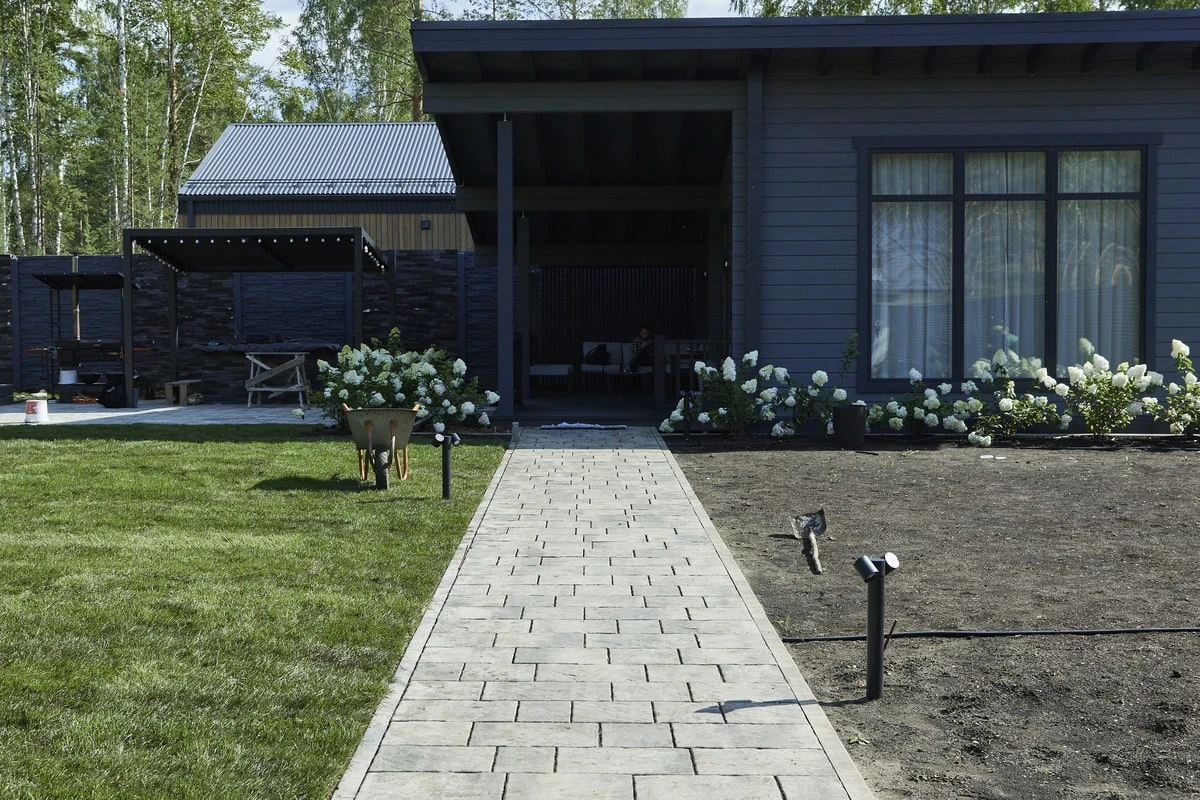 Для этих работ идеально подошли тротуарная плитка Литос в цвете Шунгит, а также бордюры в этом же цвете. Дорожки выполнены в строгом геометрическом формате с прямыми углами, ширина выбрана таким образом, чтобы как минимум два человека могли с легкостью идти рядом или разойтись на дорожке.