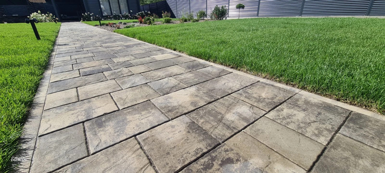 На фотографиях плитка только после кладки, швы засыпаны песком и пролиты водой для более плотной усадки песка. После высыхания и подметения брусчатка приобретает естественный товарный вид. Зоны без травы в дальнейшем усажены цветами и газоном.