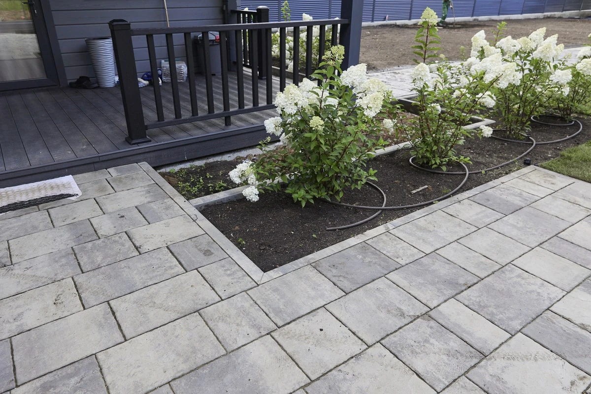 Четкие линии самой плитки дополняют геометричность укладки, делая территории еще более аккуратной. По краям от дорожек местами высажены цветы и поставлены ландшафтные украшения, которые также украшают общий дизайн в едином минималистичном стиле.