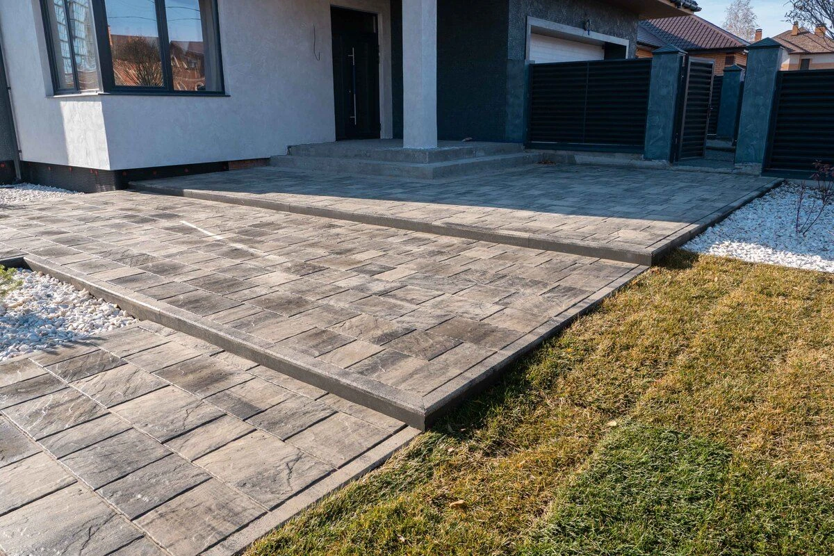 Обратите внимание, на данном объекте тротуарный бордюр использован не только для формирования границ мощения плитки, но и для формирования ступеней крыльца.