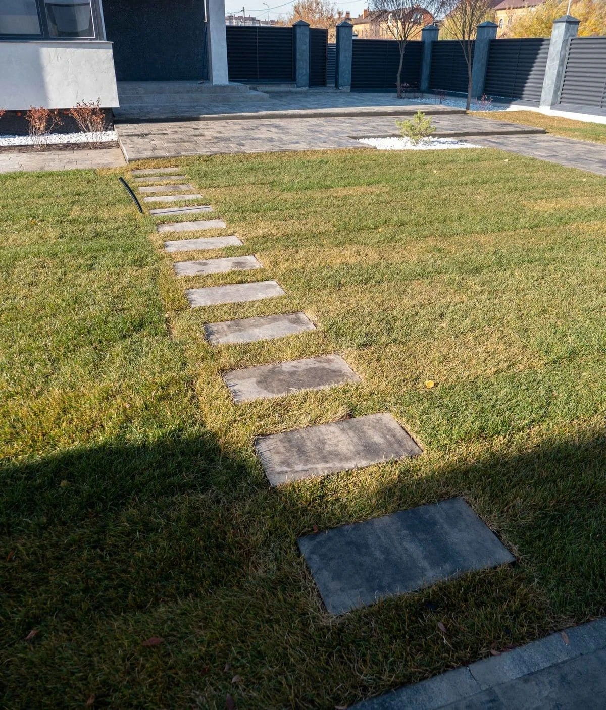Сегодня мы покажем очень интересный пример мощения крупноформатной тротуарной плиткой на участке. Это форма Литос в коллекции Листопад гладкий, цвет Антрацит. Форма представляет собой комплект из пяти плит разного размера, которые при укладке комбинируются между собой для укладки плиты на этом объекте понадобилось 226 квадратных метров.