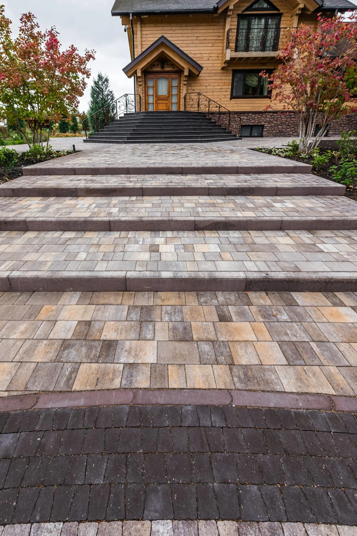 Коричневая гамма цветов сочетается друг с другом, образуя единое покрытие. Плиткой также вымощено крыльцо, входные группы, отмостка дома и клумбы.