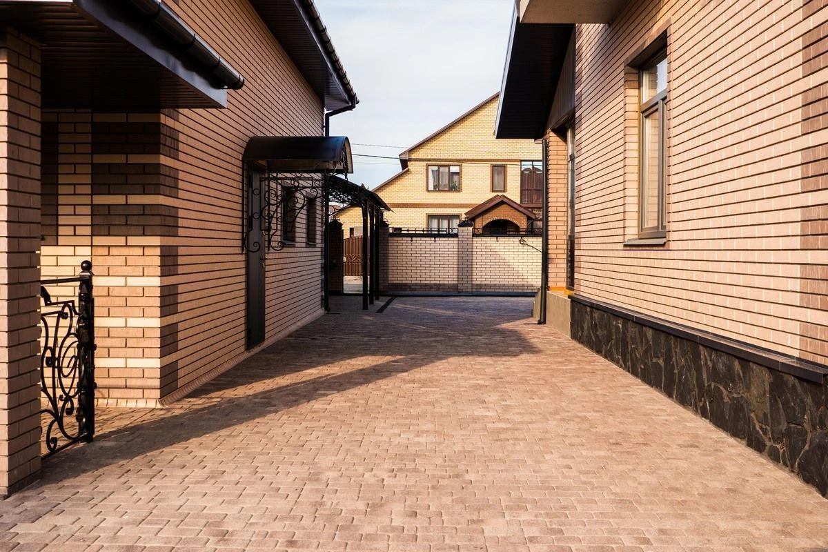 Завершилась укладки плитки в цвете Хаски в деревне Дударева. Бежево-коричневая гамма хорошо сочетается с кирпичной облицовкой фасадов.