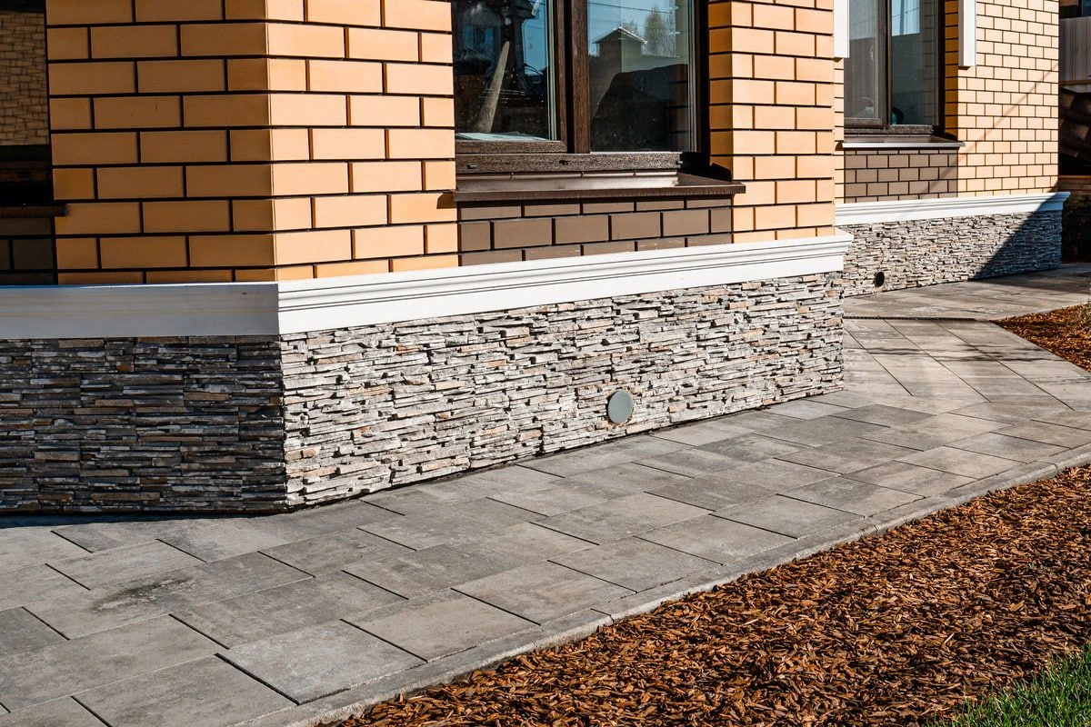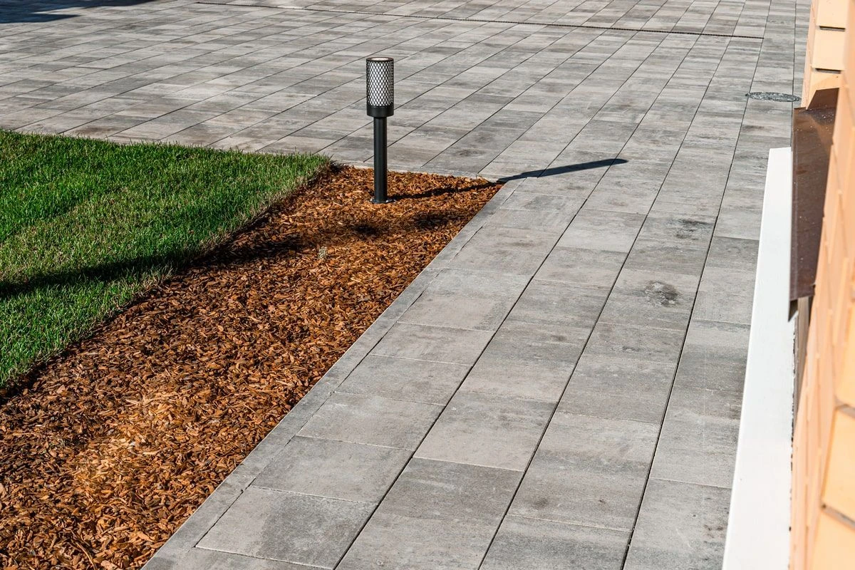 С помощью плитки была выполнена отмостка возле дома, въезд в гараж и парковочное место, входная группа у крыльца. Материалы подобраны таким образом, чтобы создать нестандартную текстуру без необходимости микса разных коллекций плитки.