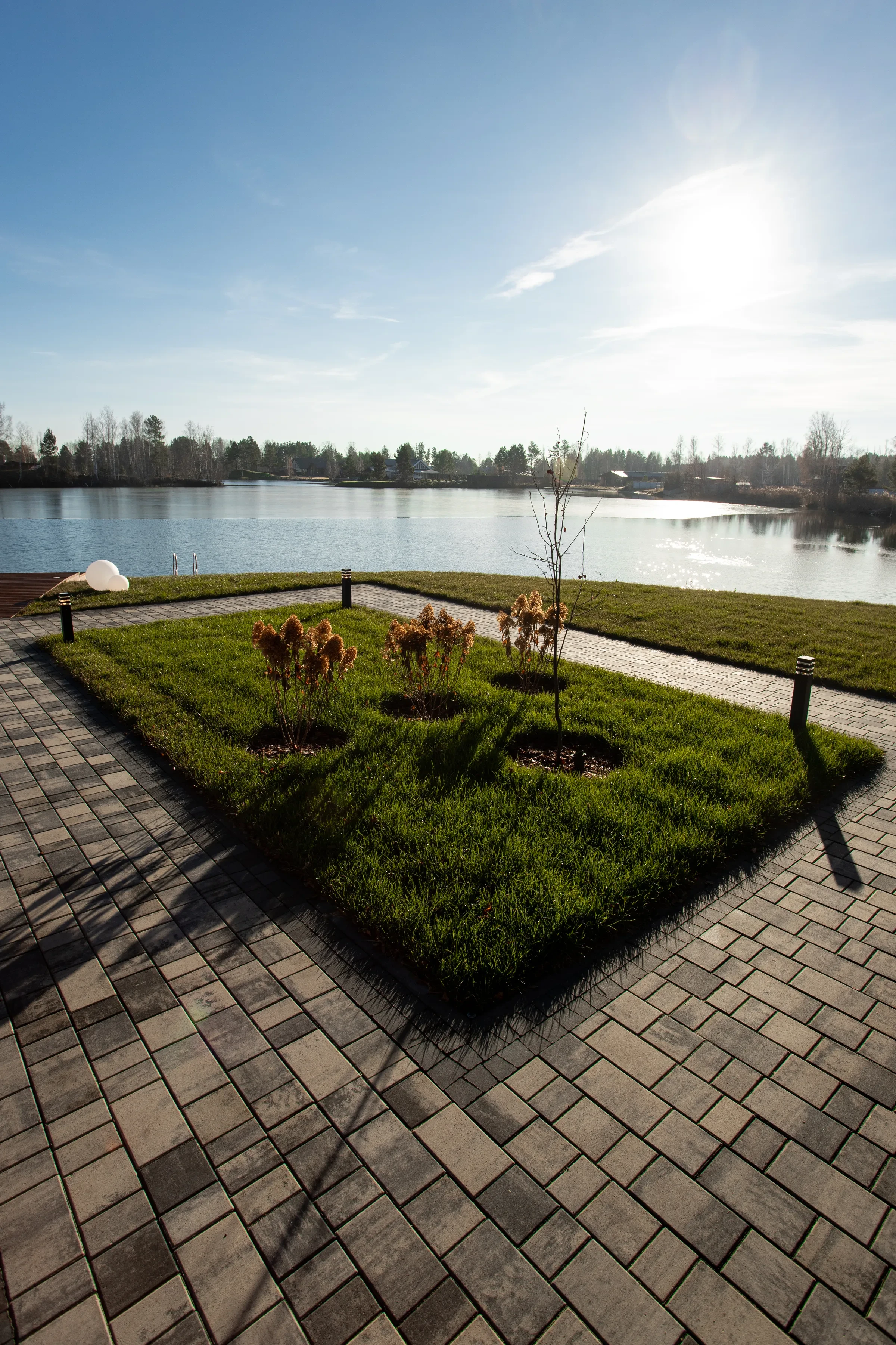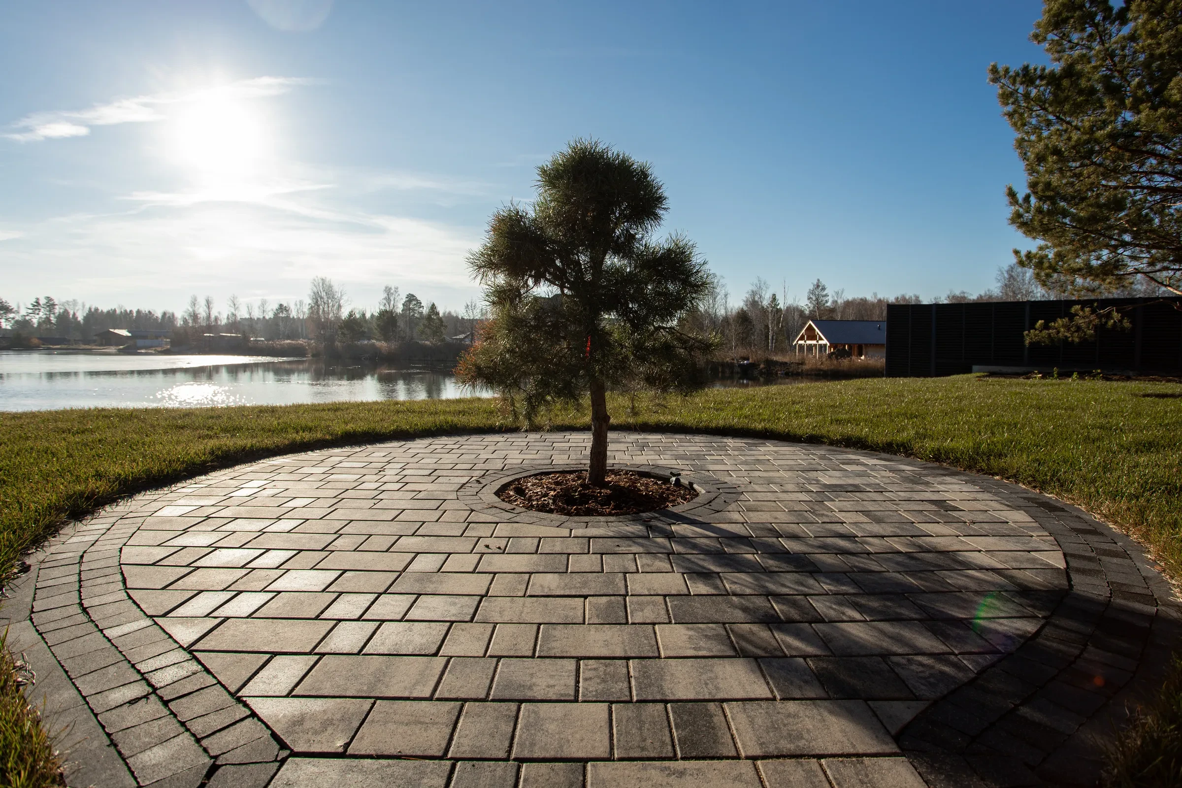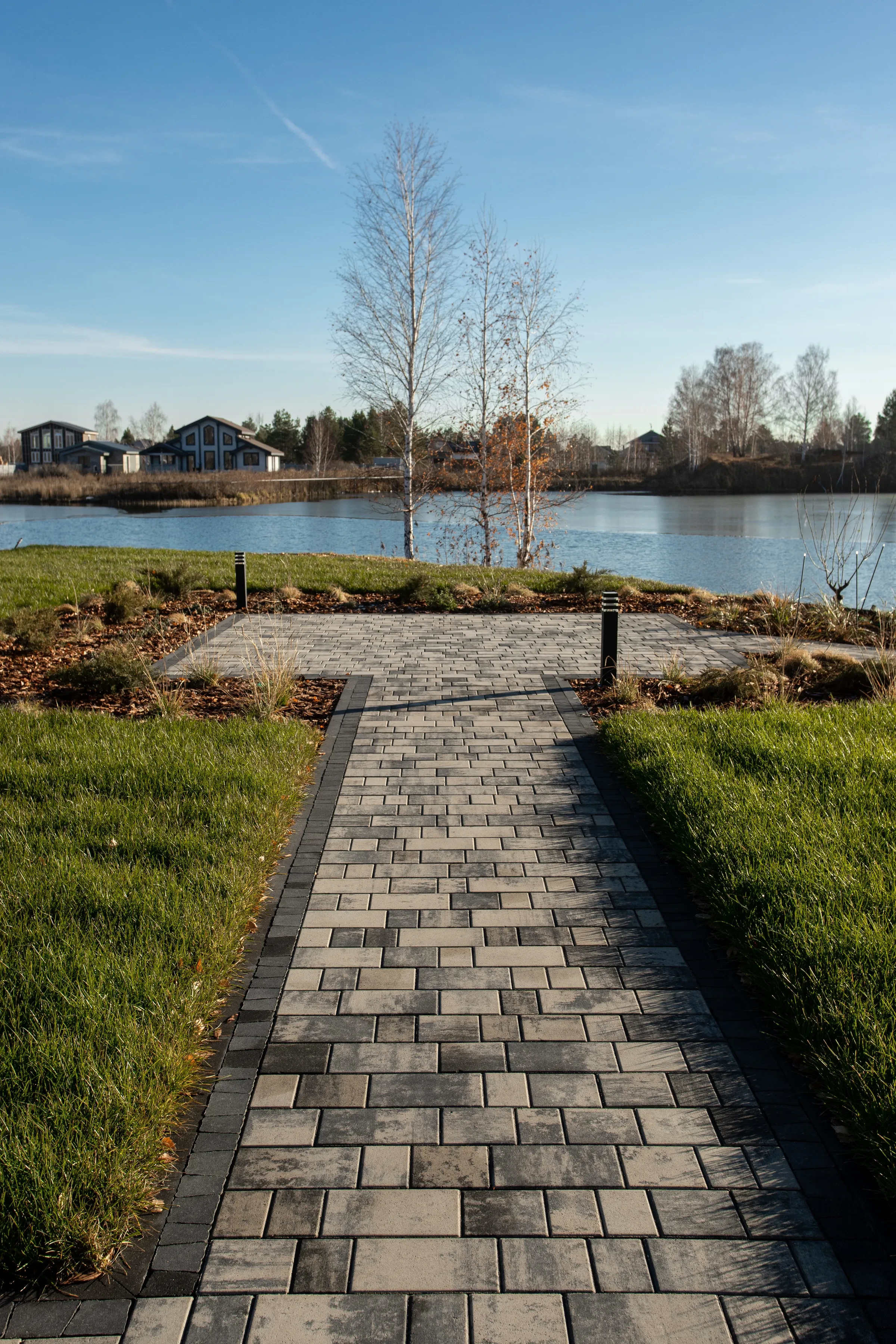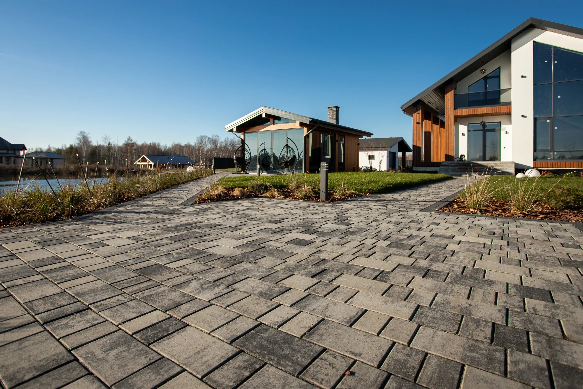 • Укладка тротуарной плиты на участке с озером