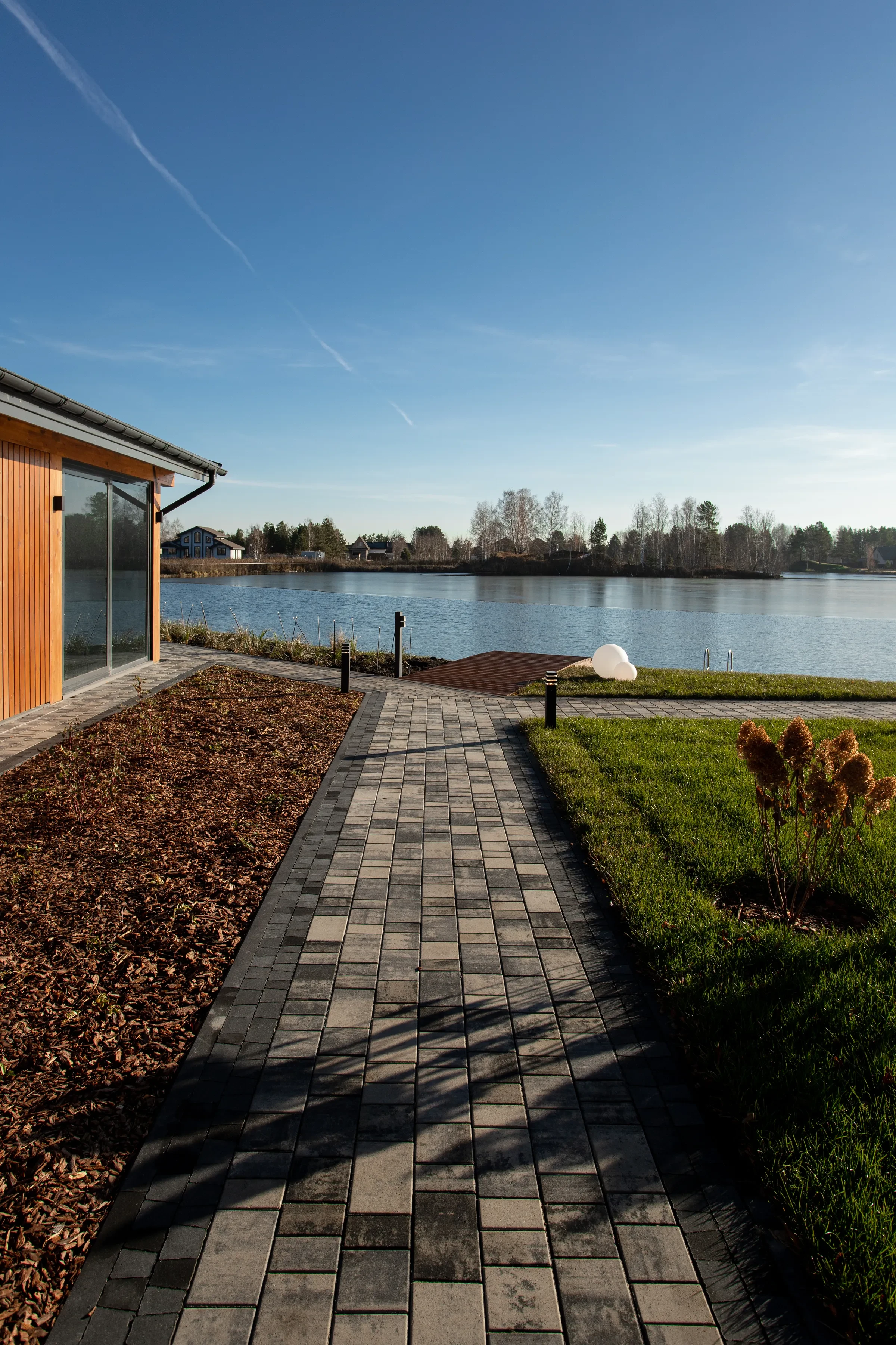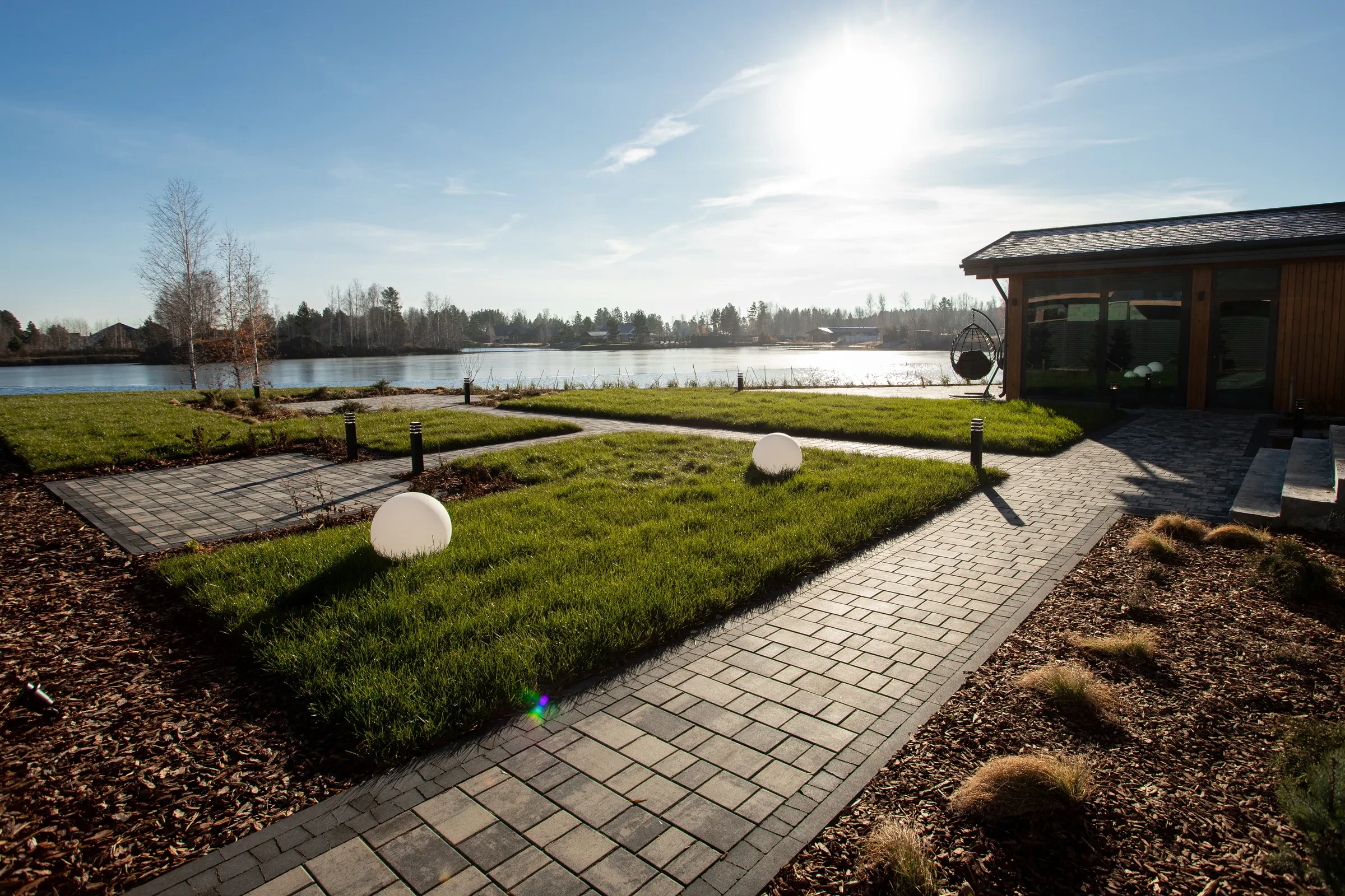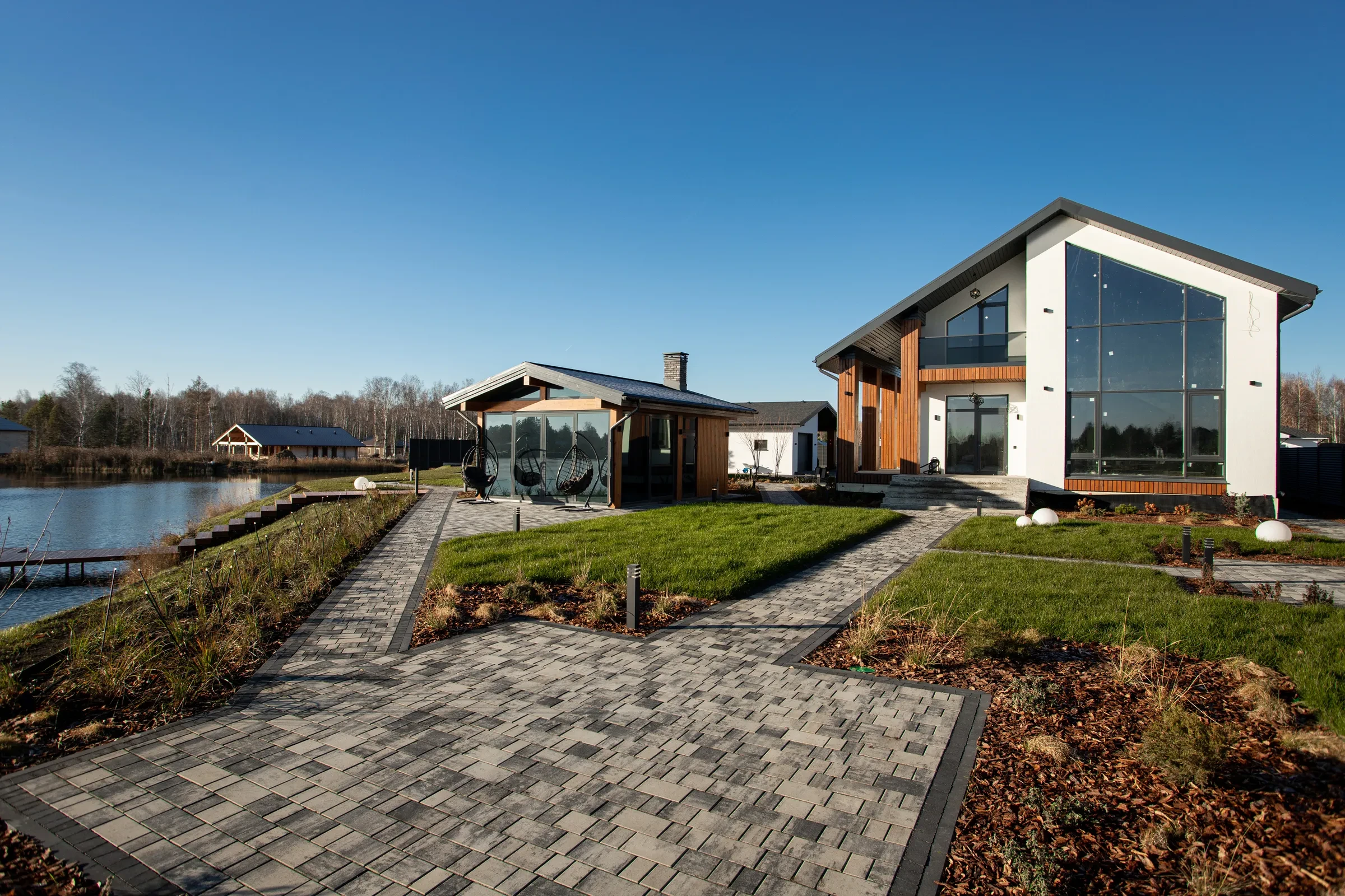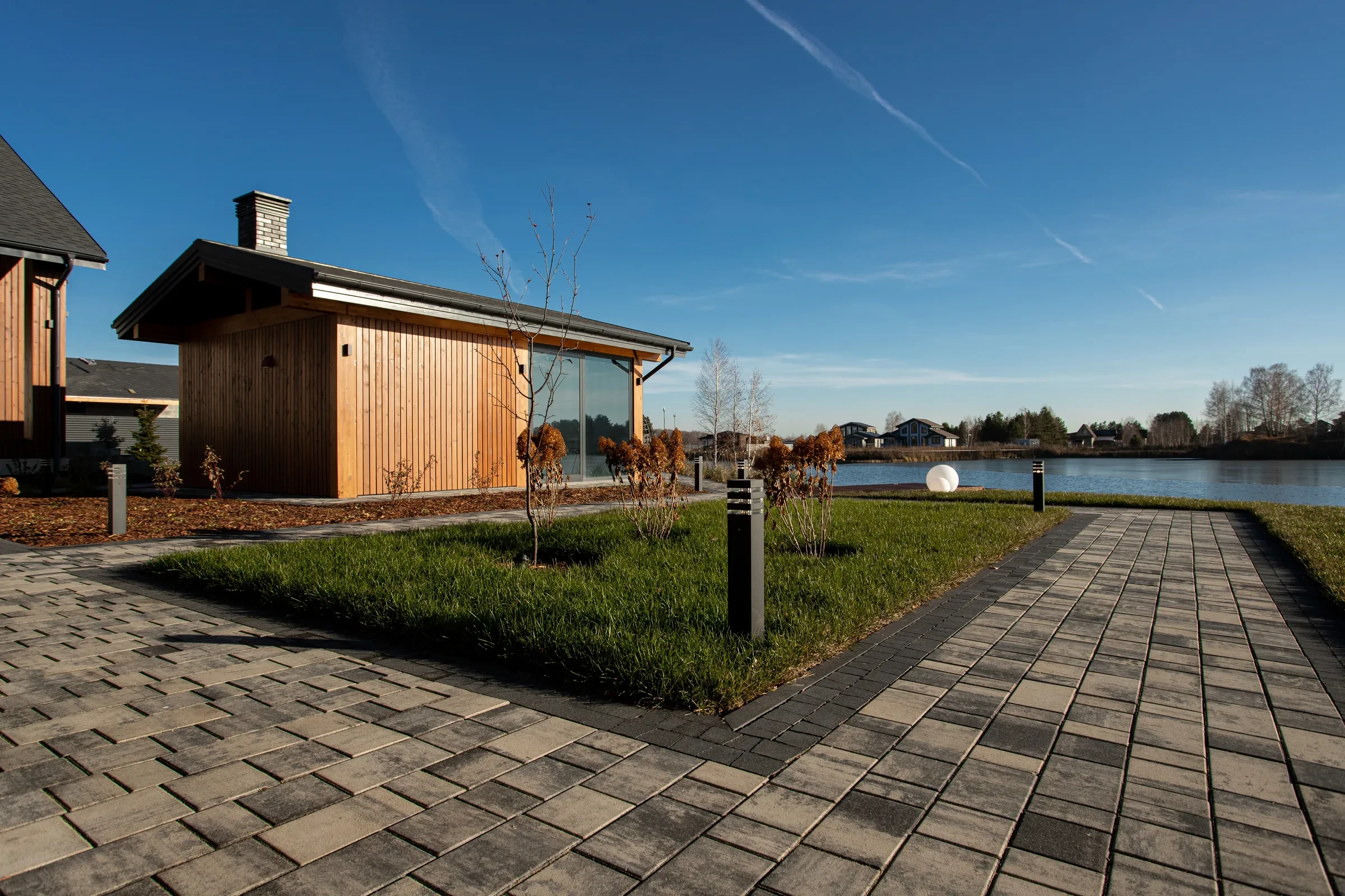 • Укладка тротуарной плиты на участке с озером