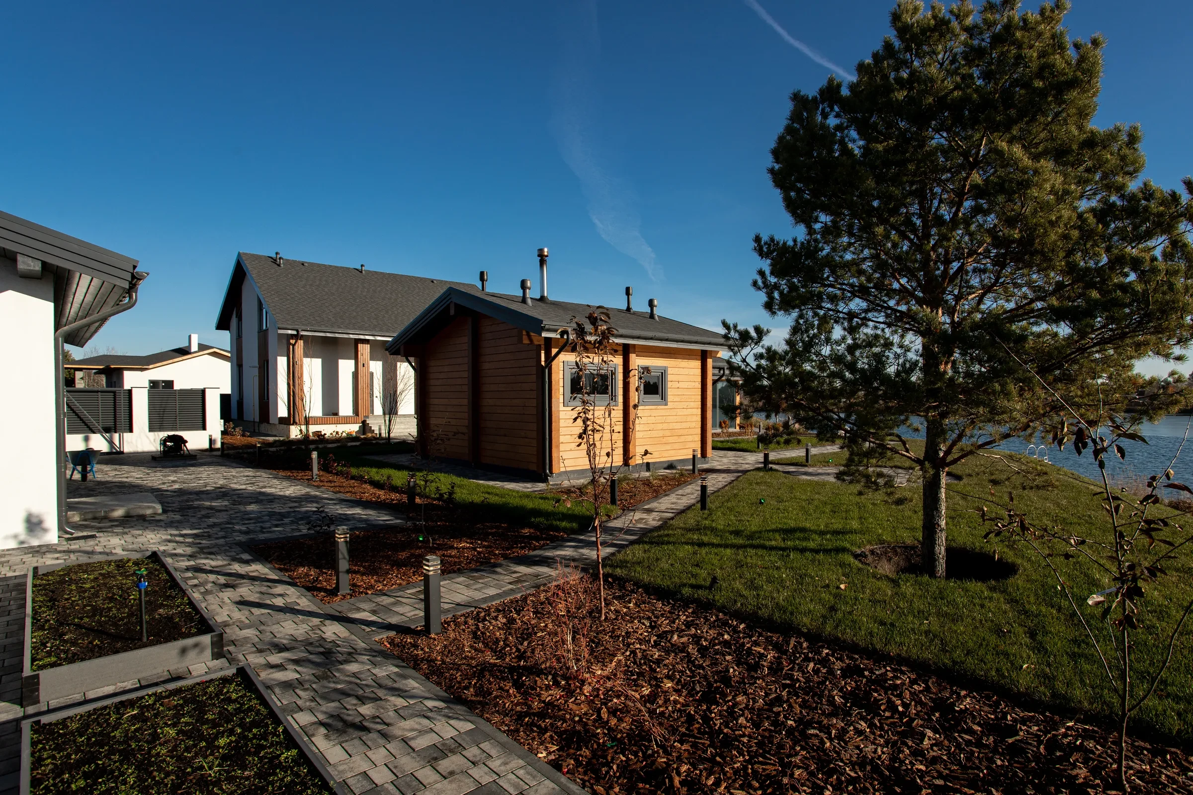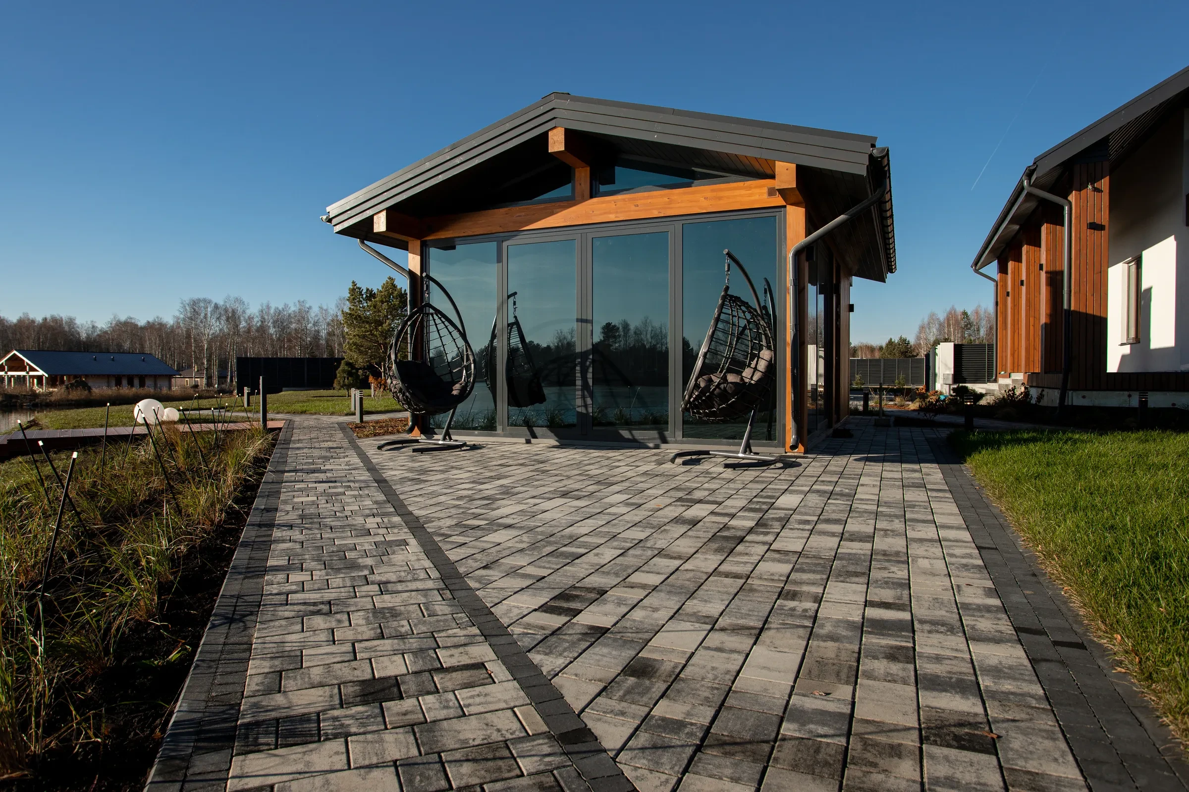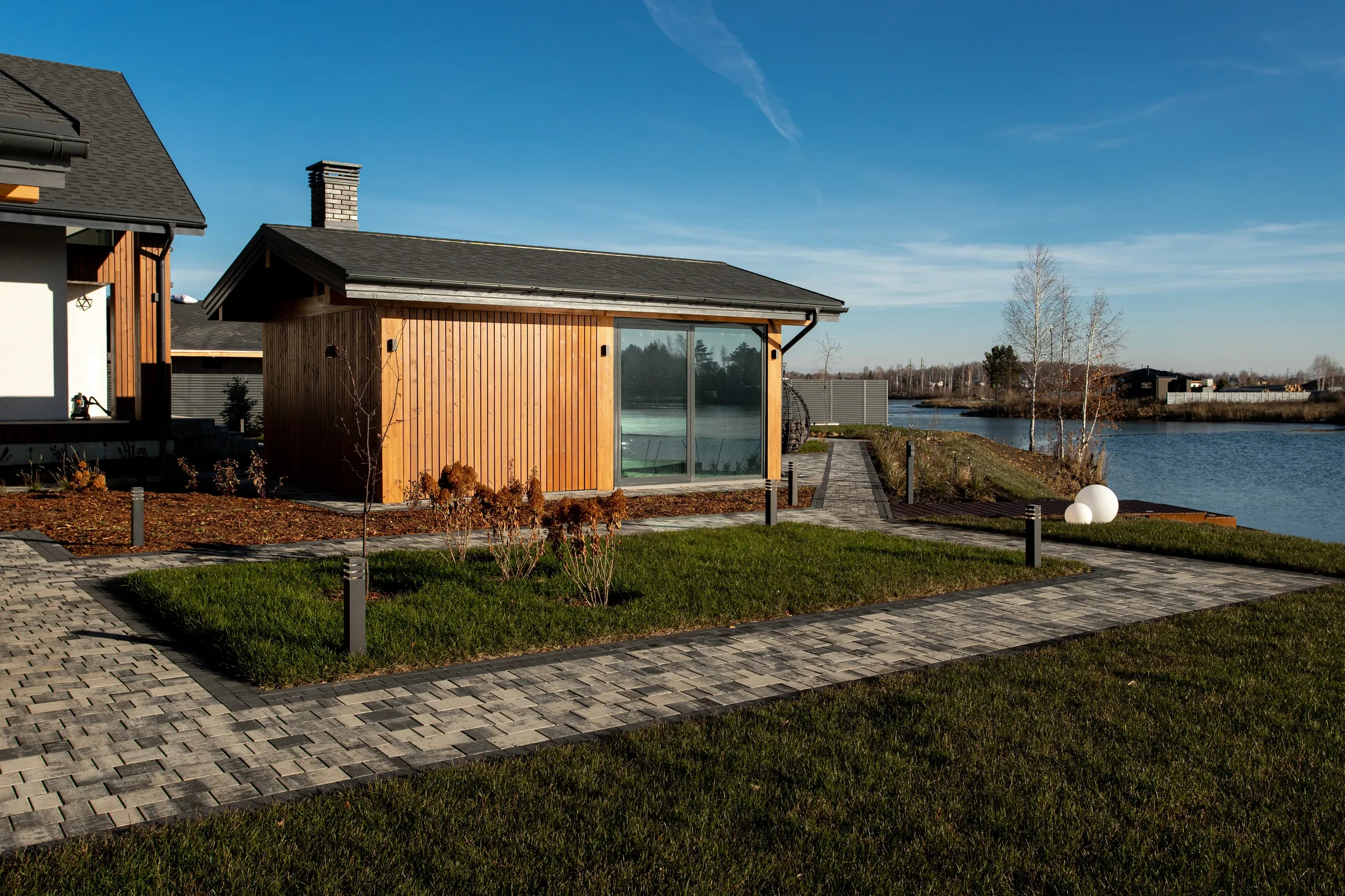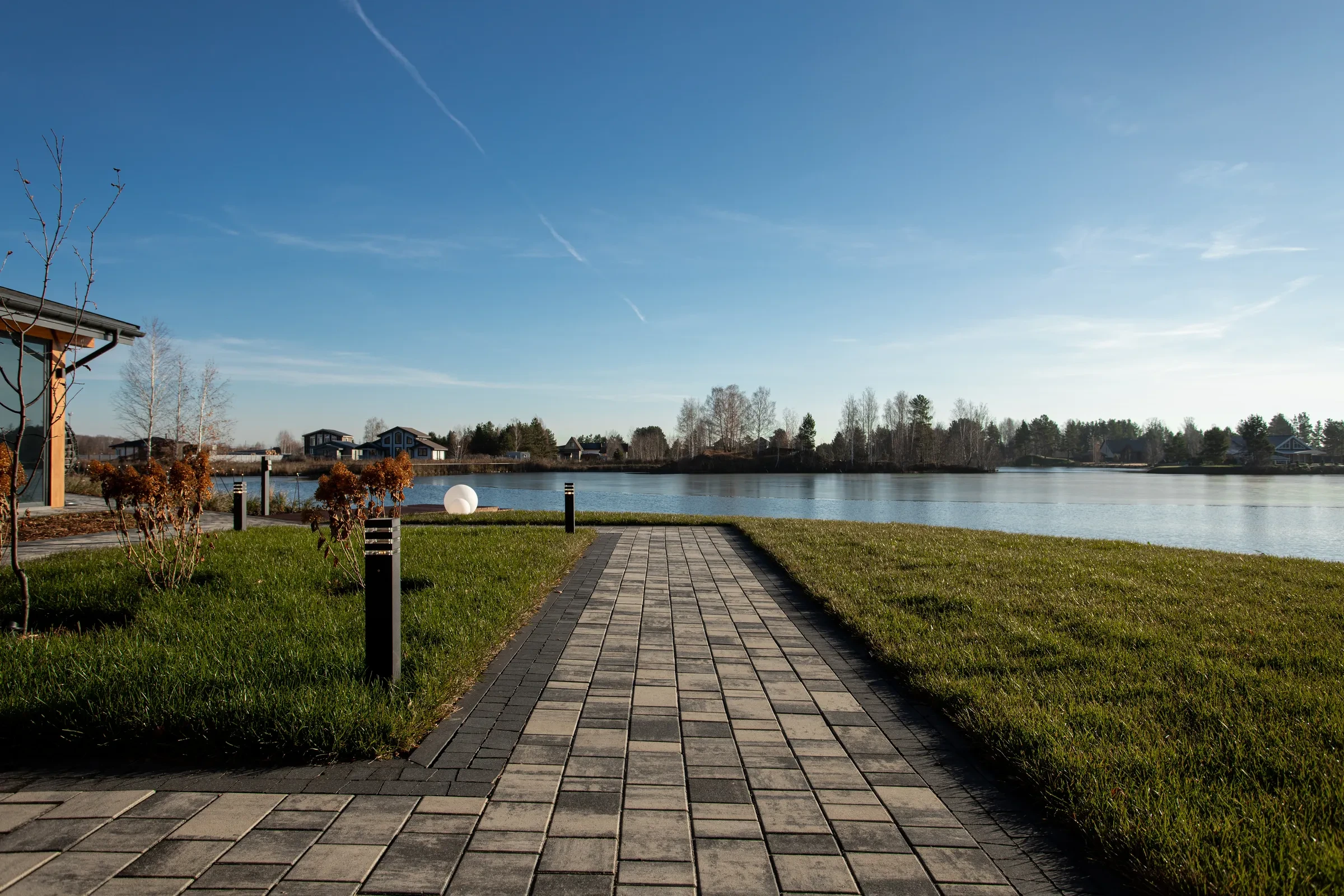 • Укладка тротуарной плиты на участке с озером