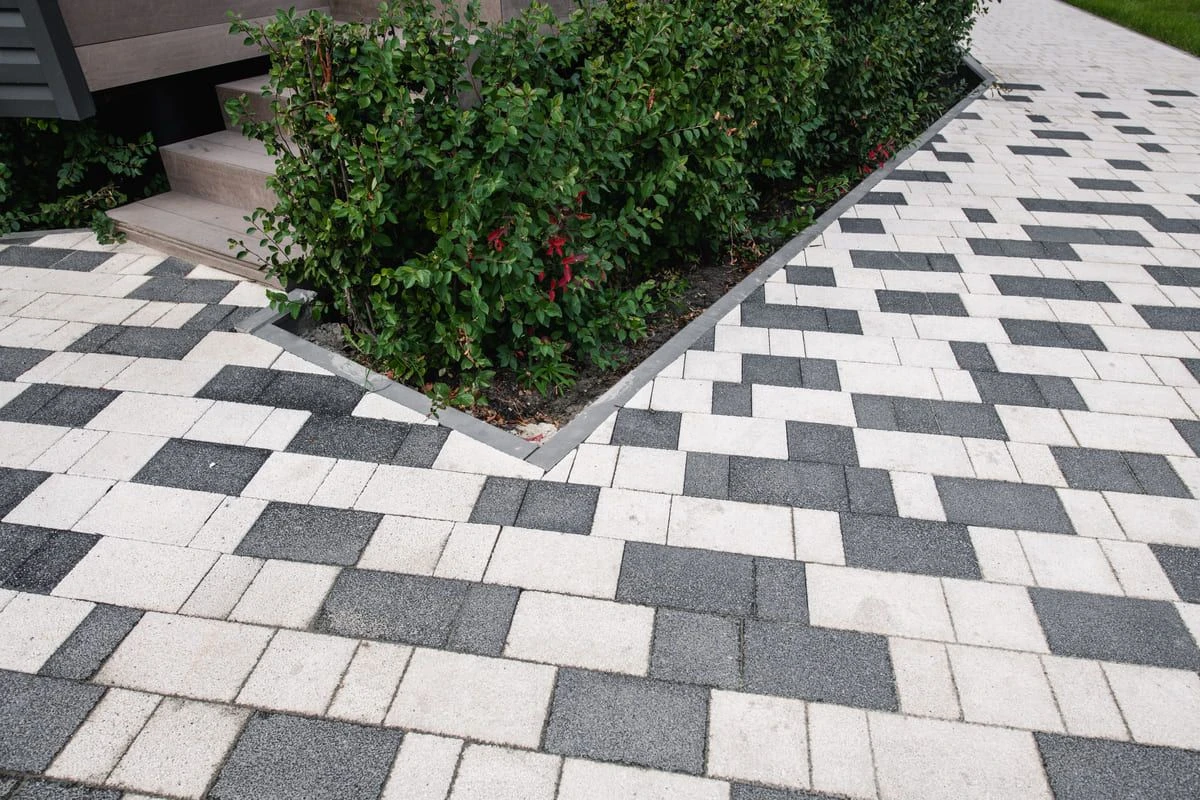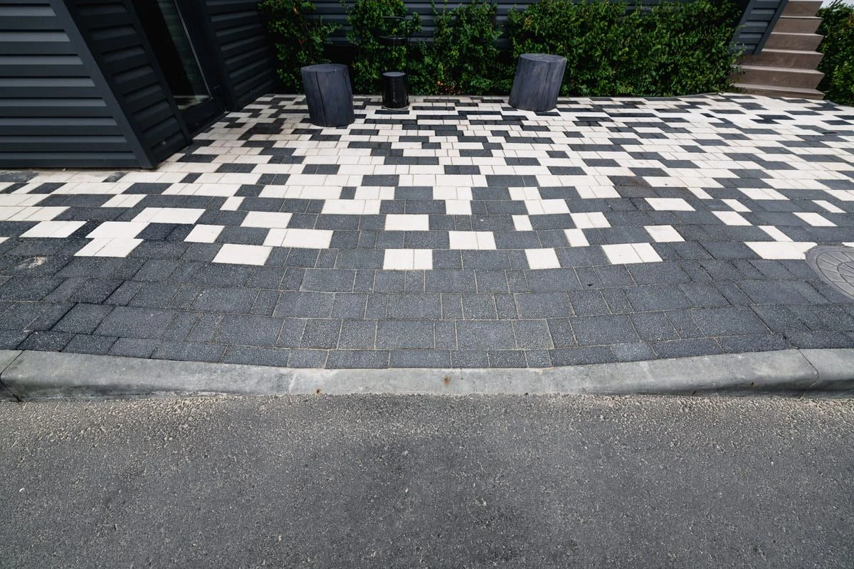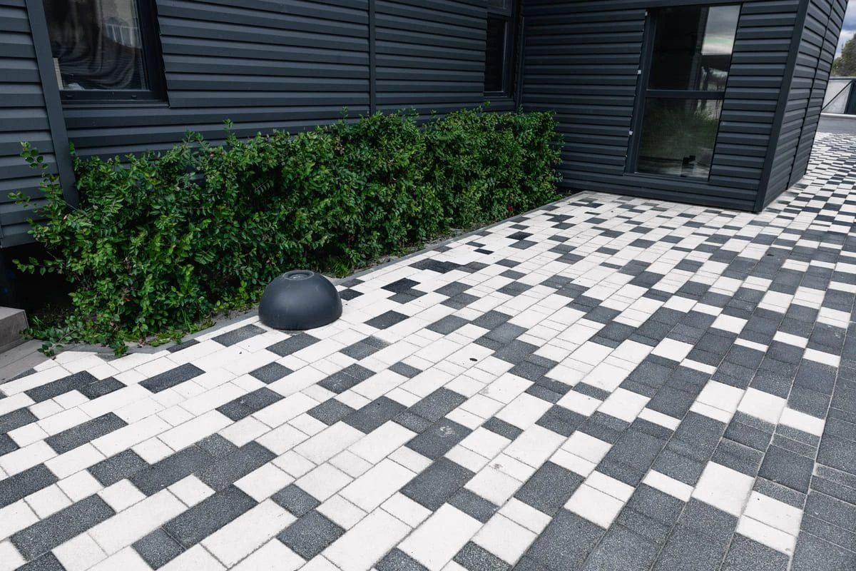 Основной рисунок выстроен с помощью хаотичной разбивки черного и белого цвета, но в местах ближе к дороге или дому плитка переходит в один цвет — черный или белый. Это визуально отделяет прогулочную зону от всех остальных, при этом подобранные цвета гармонируют с постройкой.