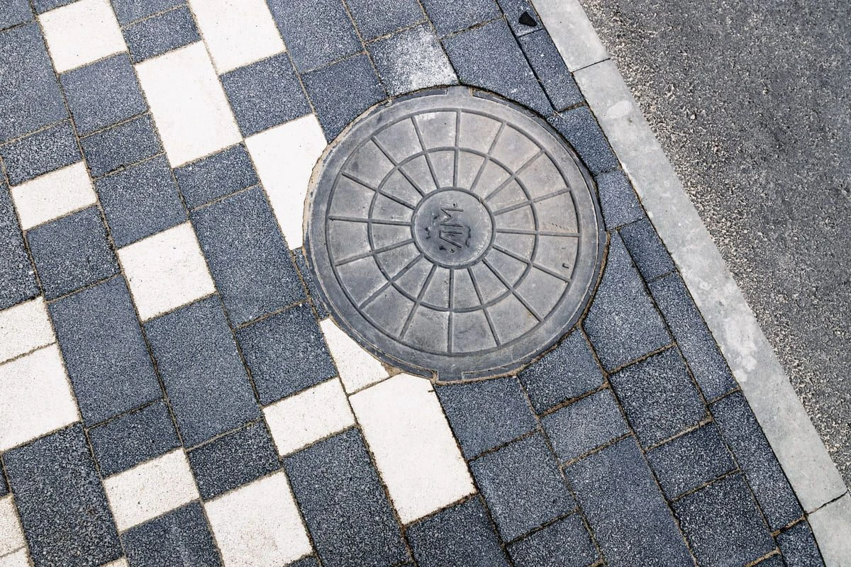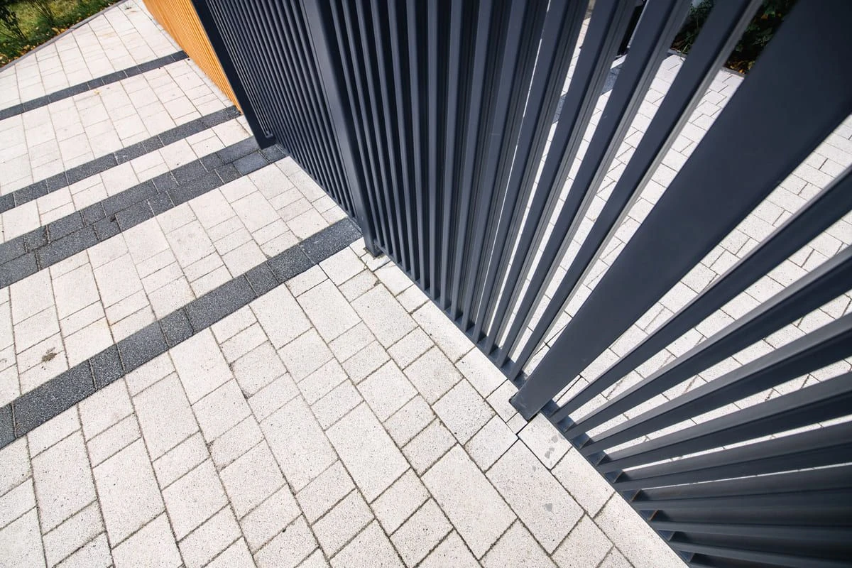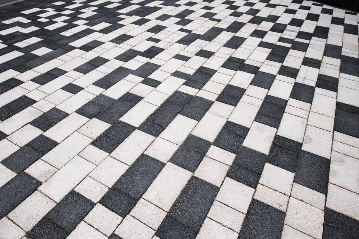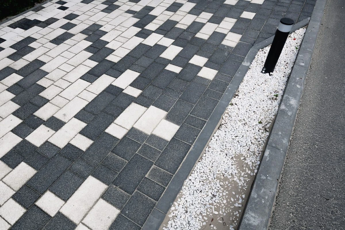 Основной рисунок выстроен с помощью хаотичной разбивки черного и белого цвета, но в местах ближе к дороге или дому плитка переходит в один цвет — черный или белый. Это визуально отделяет прогулочную зону от всех остальных, при этом подобранные цвета гармонируют с постройкой.
