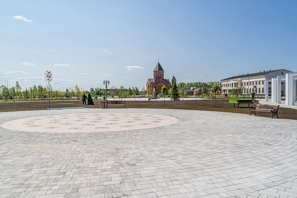 Зона фонтана и территория, где расположен памятник Маршалу И.Х. Баграмяну оформлены плиткой Старый город и прямоугольник 100 на 200 в цвете Антрацит.