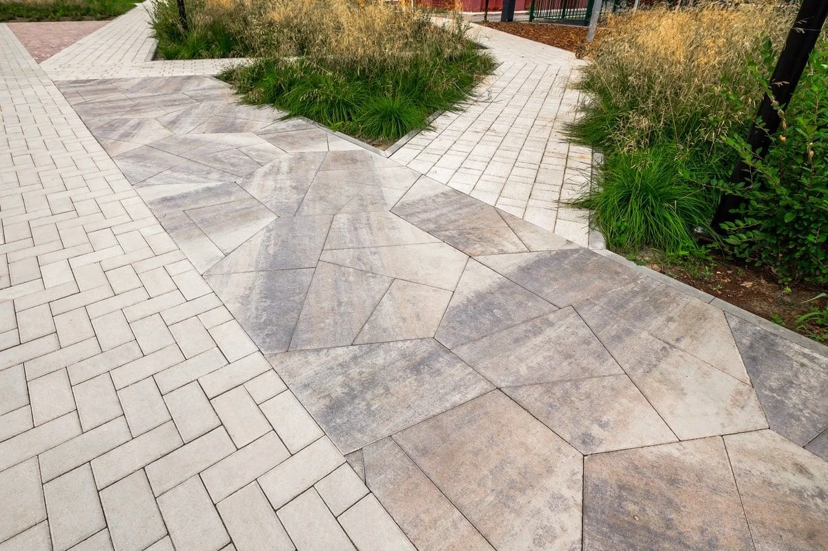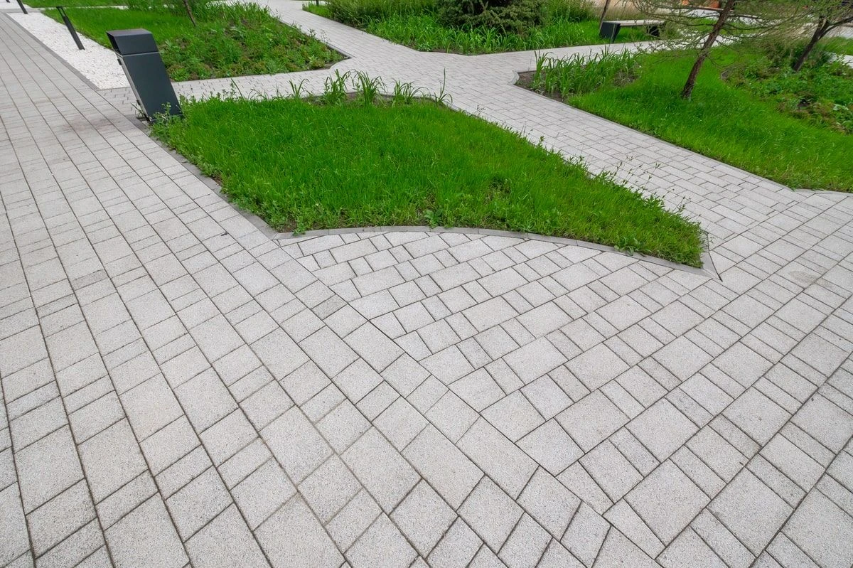 Для реализации дорожно-тропиночной сети использована тротуарная плита: Мозаика, Старый город, Классико. В светлых тонах: белый, серый и бежевый.