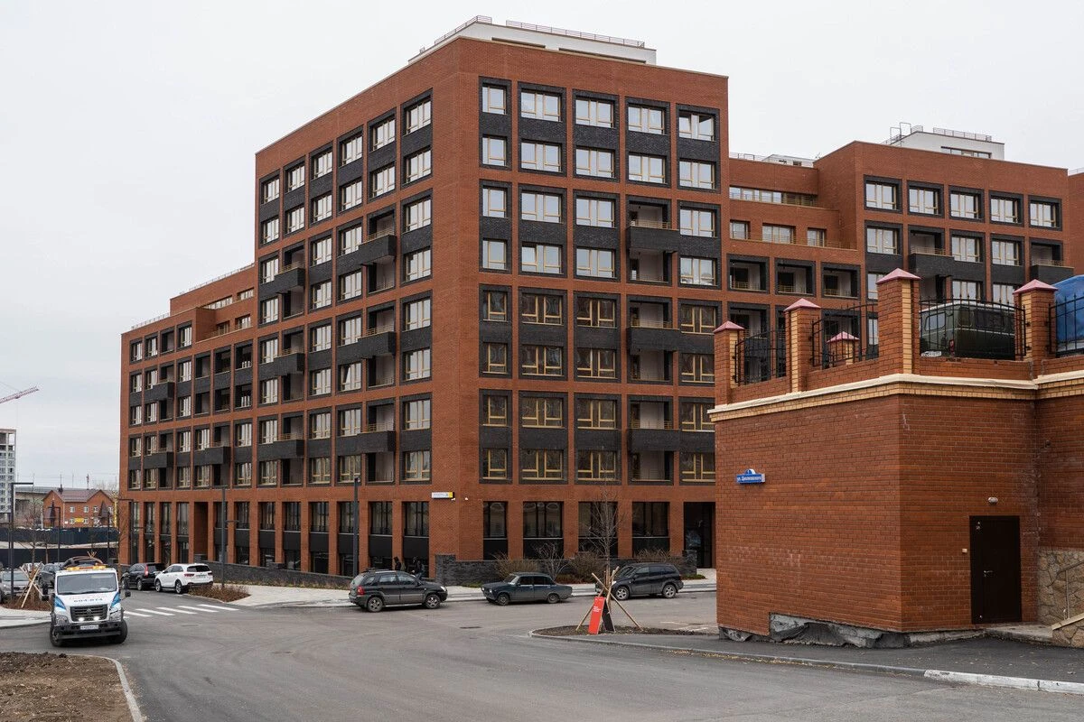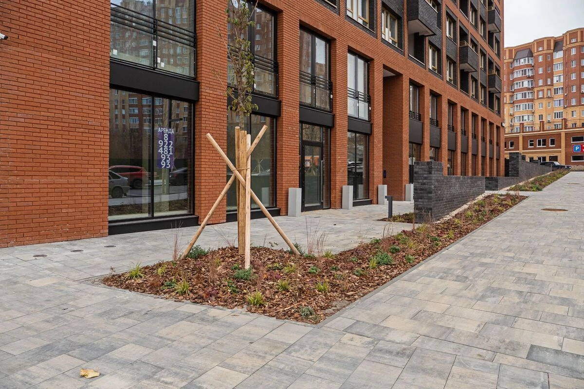 Нестандартный подход к кладке позволил создать уникальный дизайн при обустройстве комплекса. Строителям удалось сохранить минималистичный дизайн, который умело дополняется рисунками на плитах. Так рядом с асфальтированными велодорожками дорожками уложили тротуарную плитку «Прямоугольник» цвета Шунгит, визуально разделив две части дорожек для прохожих. Территория внутри дворов уложена белой плиткой «Мозаика» и «Квадрат» — разные формы также визуально отделяют дорожки друг от друга, но добавляют нестандартное видение пространству в совокупности с большой долей озеленения территории.