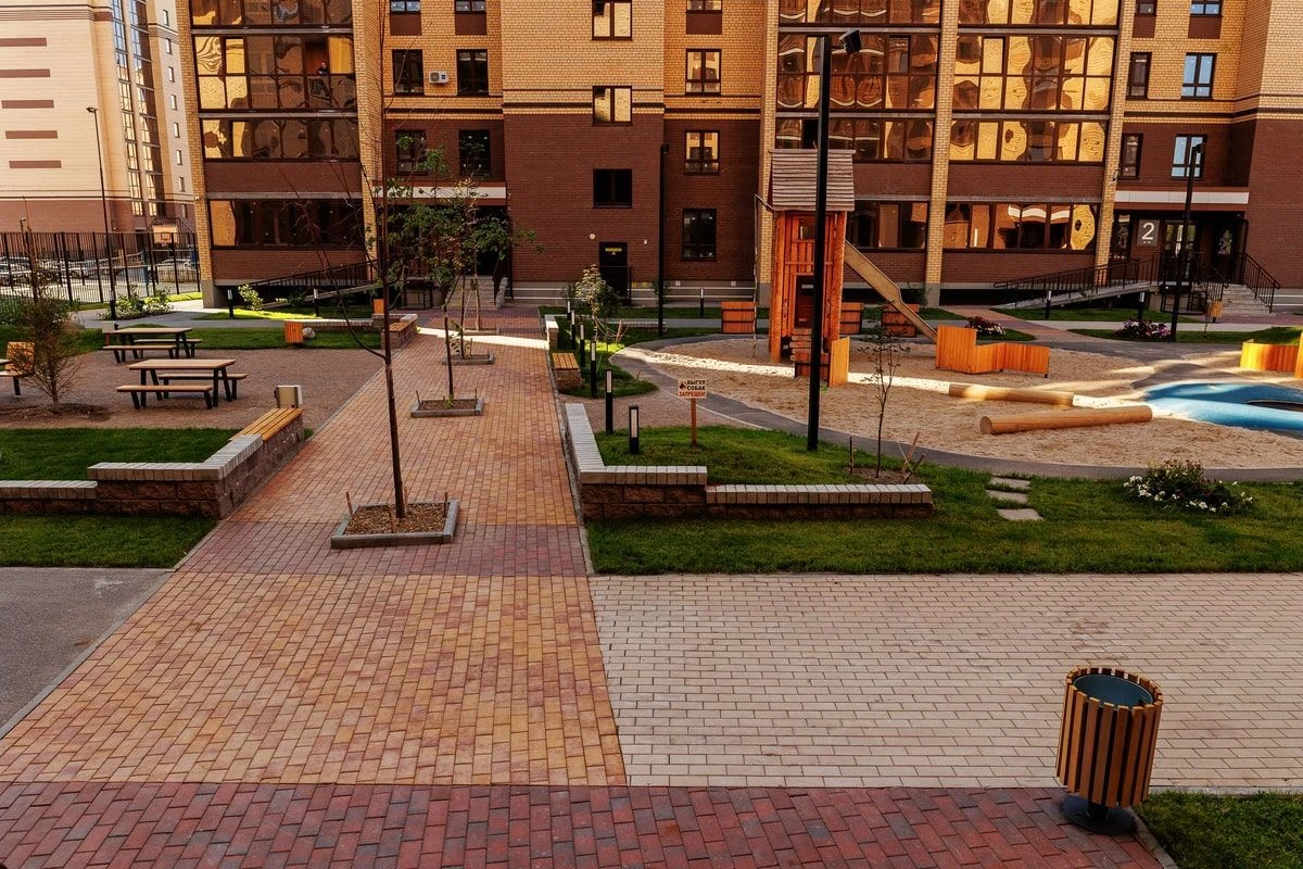 Визуально области не отделяют разные части двора, однако добавляют эффект разнообразия в дополнение к выполненным работам по благоустройству площадки. На проекте используется тротуарная плитка «Поревит» в цветах Белый, Черный, Каир и Клинкер.