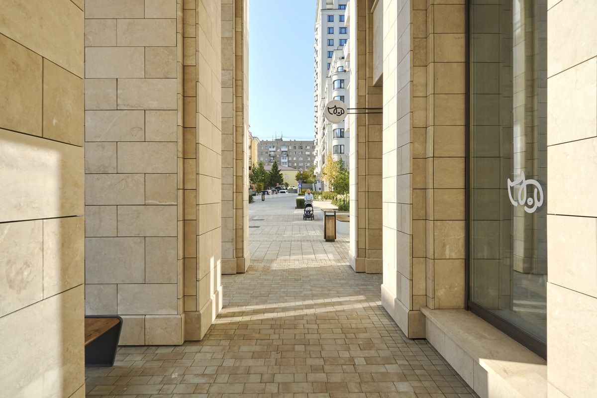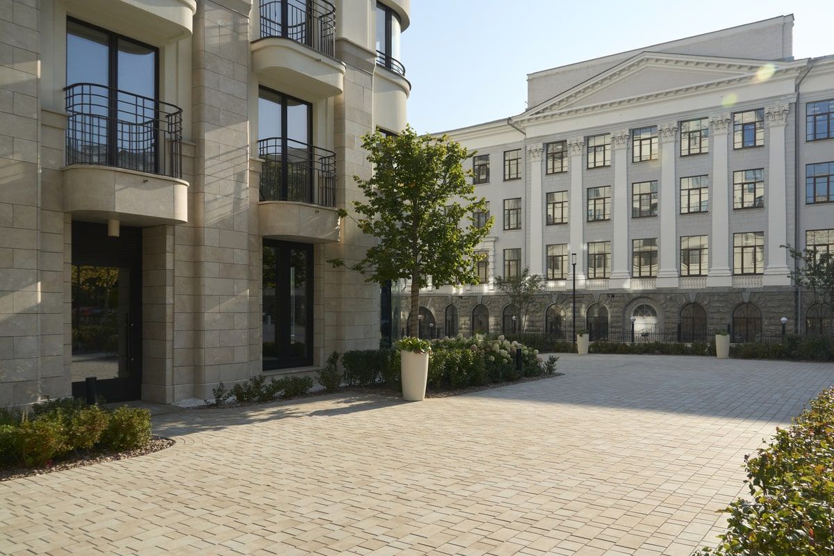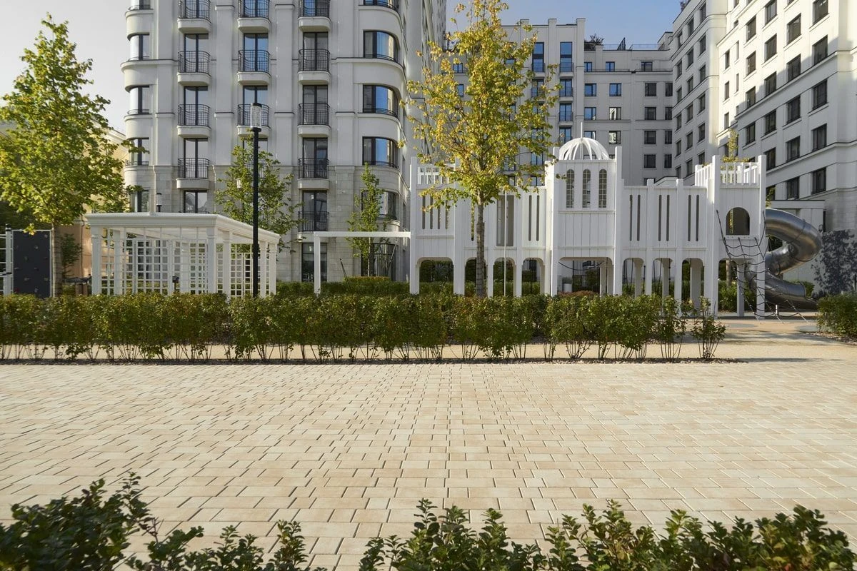 Для благоустройства территории жилого комплекса "На Некрасова" была выбрана плита формы Старый город, в цвете Степняк. А на окантовку Квадрат 100х100 мм. Песчаный цвет идеально сочетается с фасадами домов.